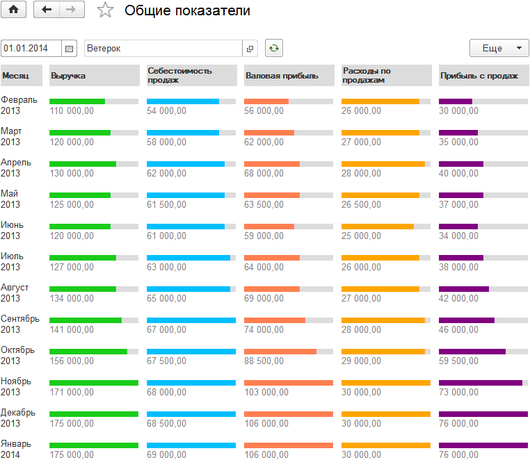 4. Для монитора Общие показатели была изменена форма представления так, чтобы руководителю было удобно анализировать помесячную динамику важнейших показателей деятельности предприятия — выручки, себестоимости продаж, валовой прибыли, расходов по продажам и прибыли с продаж.