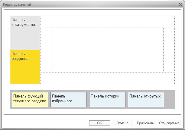 В выведенном окне пользователь может задать вид своего рабочего пространства. Для этого ему надо перетащить на рисунке прямоугольники панелей в нужные места. Чтобы панель не отображалась на экране, ее нужно перенести вниз на этом рисунке, на прямоугольное поле с серым фоном.