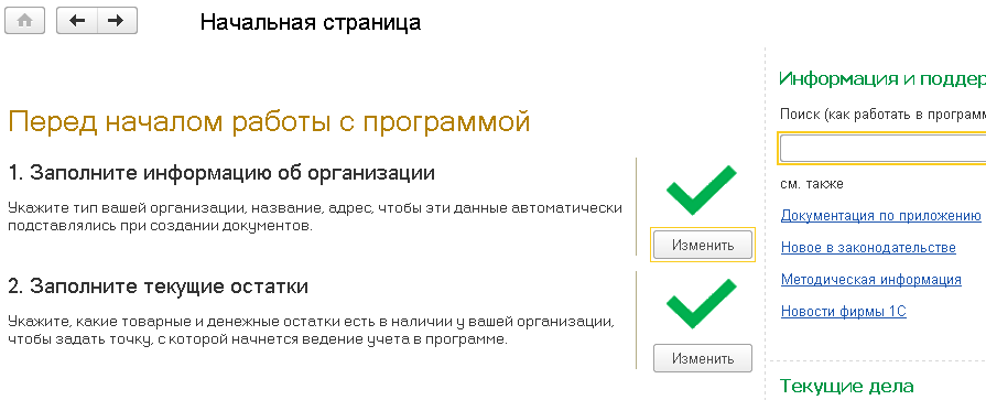 Разработчики сделали так, что при первом запуске программы пользователю с полными правами на начальной странице показывается форма Перед началом работы с программой. Там предлагается ввести сведения об организации и текущих остатках.