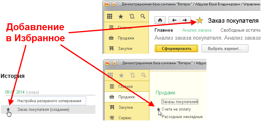 Строки в панель Избранное помещает сам пользователь — у каждого пользователя панель Избранное своя. Чтобы добавить в панель Избранное ссылку на форму, команду или документ, надо нажать на звездочку: