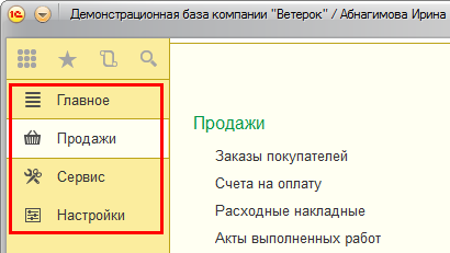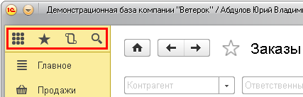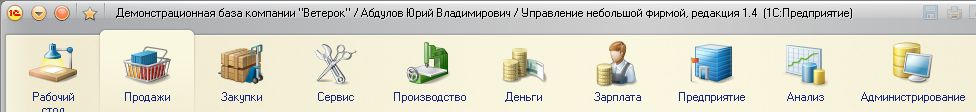 В интерфейсе «Такси» имеется маленькая панель инструментов. В программе «1С:Управление небольшой фирмой» она по умолчанию выводится над панелью разделов программы: