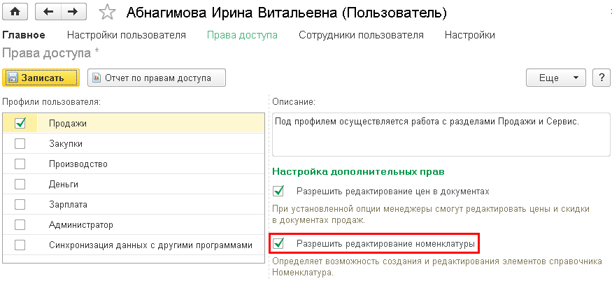 Эта возможность позволяет запретить менеджеру по продажам редактировать справочник Номенклатура. Возможность тоже введена по просьбам пользователей. Она позволяет предотвратить засорение справочника Номенклатура дублирующими записями, введенными недостаточно квалифицированными сотрудниками, которые не смогли или не захотели найти нужную запись в этом справочнике, и создали вместо этого свою запись.