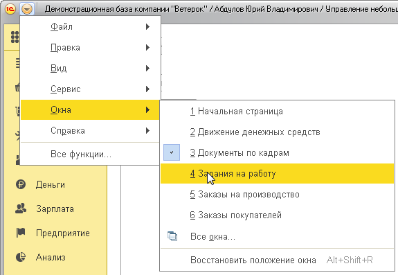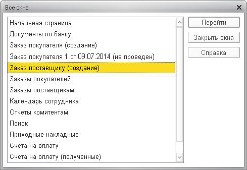 Пользователи, ранее работавшие в режиме интерфейса «формы в закладках», часто спрашивают, как можно перейти в другое окно программы, или желают вывести на экран список открытых окон.