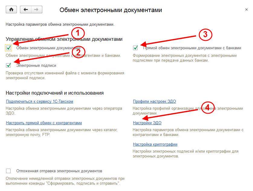 После заключения соглашения с банком и получения от него параметров для авторизации подключения к сервису банка, можно перейти к настройкам прямого обмена с банком в программе «1С:Управление небольшой фирмой». Для этого надо перейти в раздел Настройки|Обмен электронными документами и установить опции Обмен электронными документами, Электронные подписи и Прямой обмен электронными документами с банками.