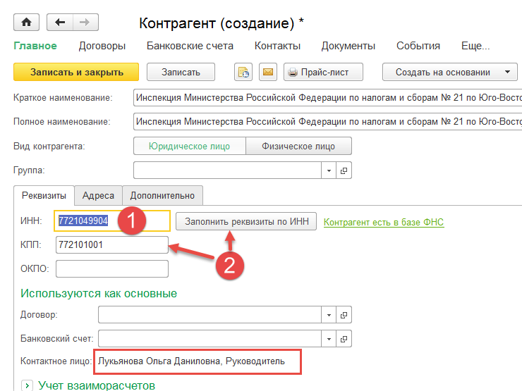 При создании нового контрагента теперь достаточно заполнить поле ИНН и нажать кнопку Заполнить реквизиты по ИНН или просто перейти к следующему полю по клавише Enter. Если ИНН введен корректно и сведения о контрагенте есть в государственном реестре, то реквизиты заполняются автоматически.