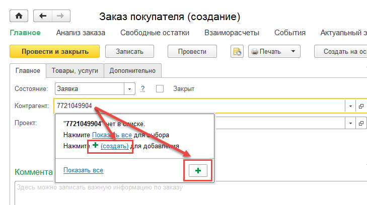 Создать нового контрагента с помощью функции автозаполнения реквизитов можно из любого документа или справочника программы. Для этого в поле ввода контрагента вместо названия можно ввести ИНН. Если в справочнике Контрагенты нет контрагента с таким ИНН, программа предложит создать нового. По кнопке Создать откроется уже заполненная форма нового контрагента.