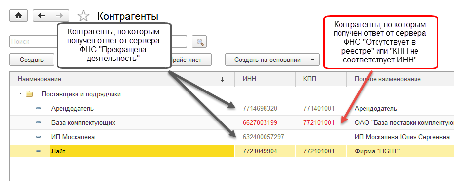 В "1С:Управление небольшой фирмой" реализован удобный способ получения и работы с такой информацией: "проблемные" контрагенты, сведения о которых не обнаружены в базе ФНС (по причине неправильных реквизитов или снятия с учета в ФНС), выделяются в форме списка контрагентов и в карточке контрагента.