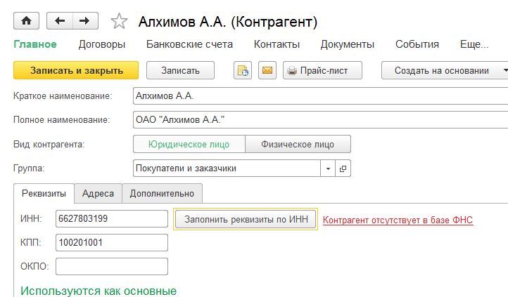 Для физического лица (предпринимателя) заполняются краткое, полное наименование и при сохранении создается физическое лицо.