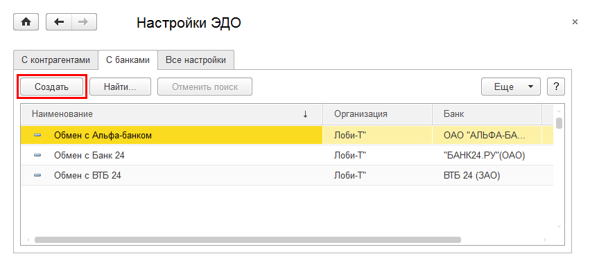 После этого можно перейти в раздел Настройки ЭДО и создать настройку прямого обмена с банком.