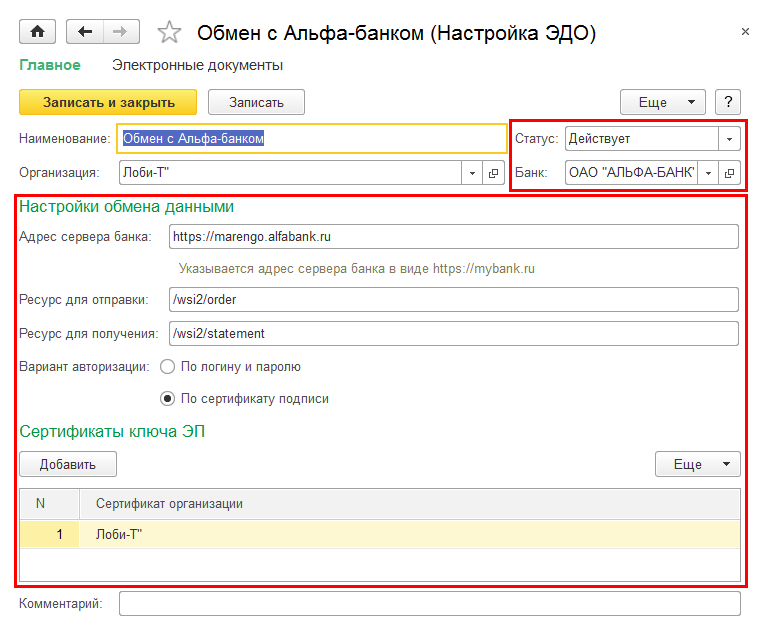 В форме настройки необходимо указать банк, с которым будет производиться обмен (если банков несколько, для каждого банка надо создать отдельную настройку), а также параметры подключения и авторизации на ресурсе банка, которые выдал банк при заключении соглашения. В зависимости от банка, возможны 2 варианта авторизации при подключении – По логину и паролю или По сертификату подписи. Если авторизация производится по сертификату подписи, необходимо зарегистрировать сертификат в системе и добавить в табличную часть Сертификаты ключа ЭП. После того, как все параметры заполнены, можно записать настройку и перейти к выполнению обмена.