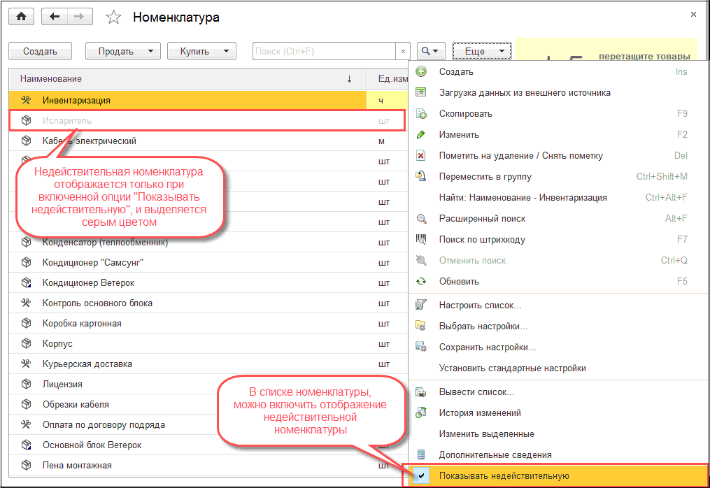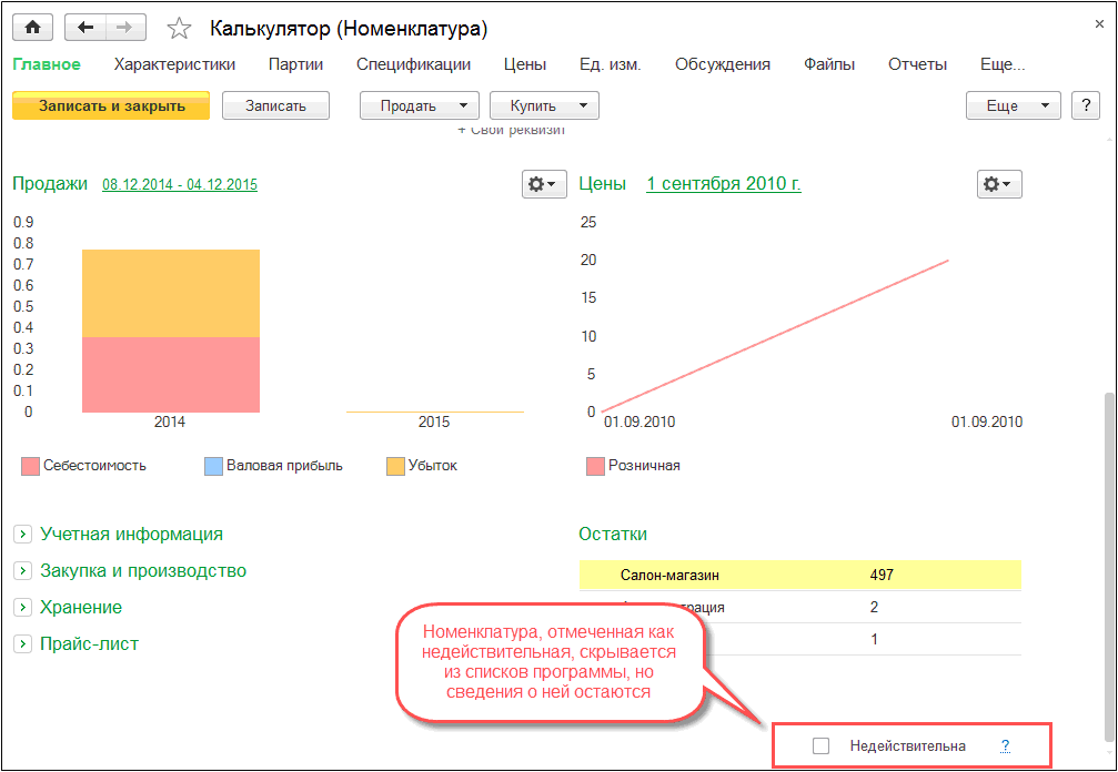 Номенклатура, отмеченная как недействительная, скрывается при интерактивном выборе из списков, но сведения о ней остаются.