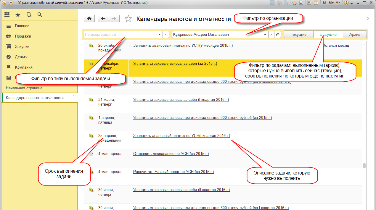 Если из программы сдается регламентированная отчетность индивидуального предпринимателя, то появляется специальный «Календарь налогов» для отображения задач по сдаче отчетности.
