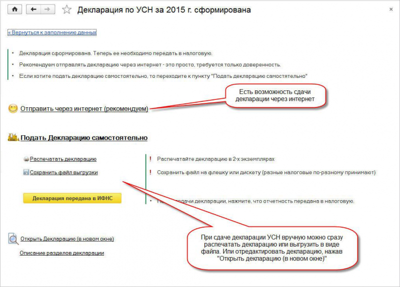 Отчётность можно отправить из программы, используя сервис 1С-Отчетность, или сдавать вручную.