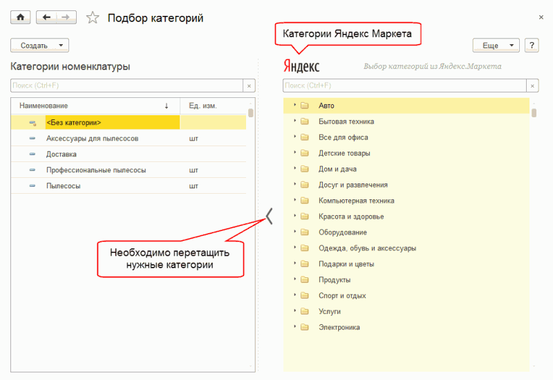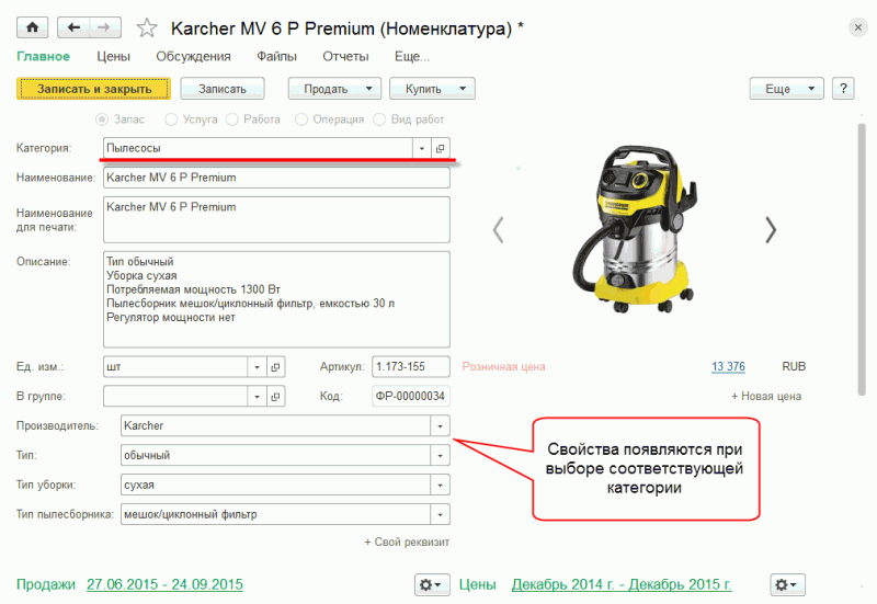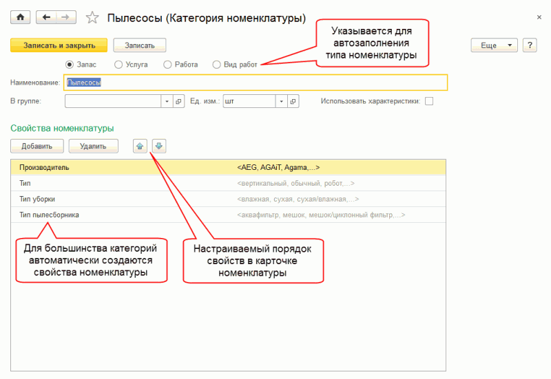 Для каждой категории из сервиса также поставляется список свойств номенклатуры и значения для каждого свойства. Например, для пылесоса это может быть тип уборки (сухая, влажная) и тип пылесборника (аквафильтр, мешок). Теперь не нужно набирать эти свойства вручную, всё что требуется это выбрать значение нужного свойства из выпадающего списка.