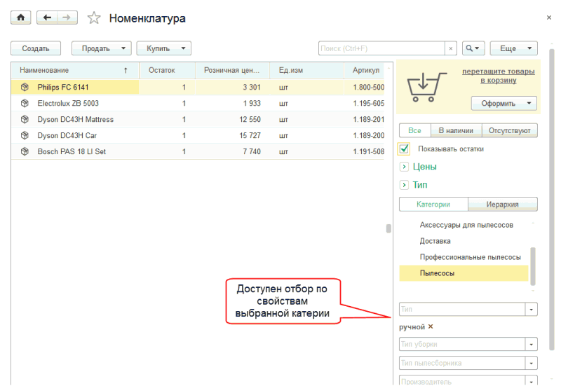 Так же по значениям свойств выбранной категории доступен отбор в списке справочника «Номенклатура».
