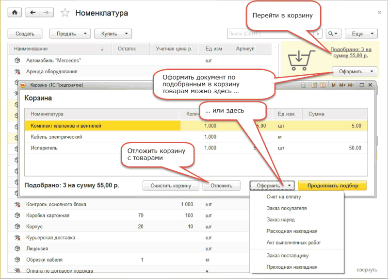 Список номенклатуры стал полноценным рабочим местом: корзина, остатки и цены, фильтры, оформление документов!