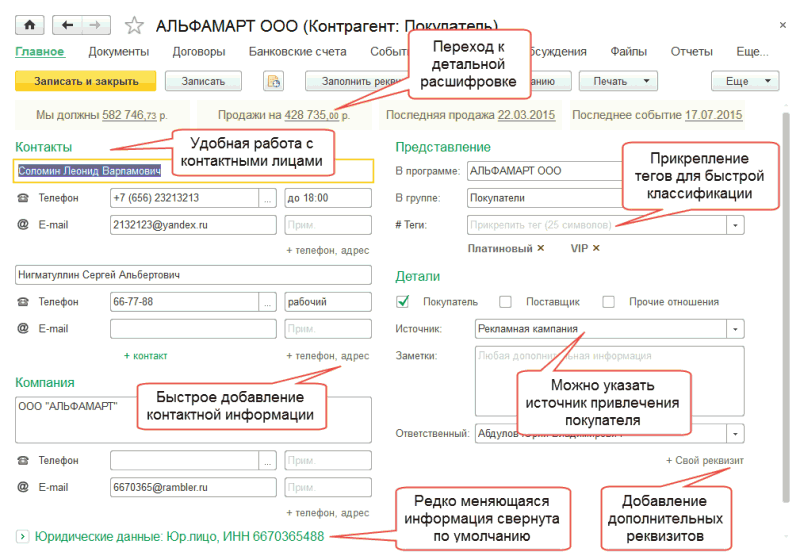 Кроме того, появилась возможность быстрого добавления контактной информации, прикрепления тегов и добавления дополнительных реквизитов.