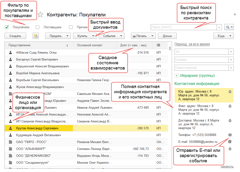 В правой панели списка контрагентов и в списках документов доступна панель контактной информации, содержащая полную контактную информацию о контрагенте и его контактных лицах для текущего документа.