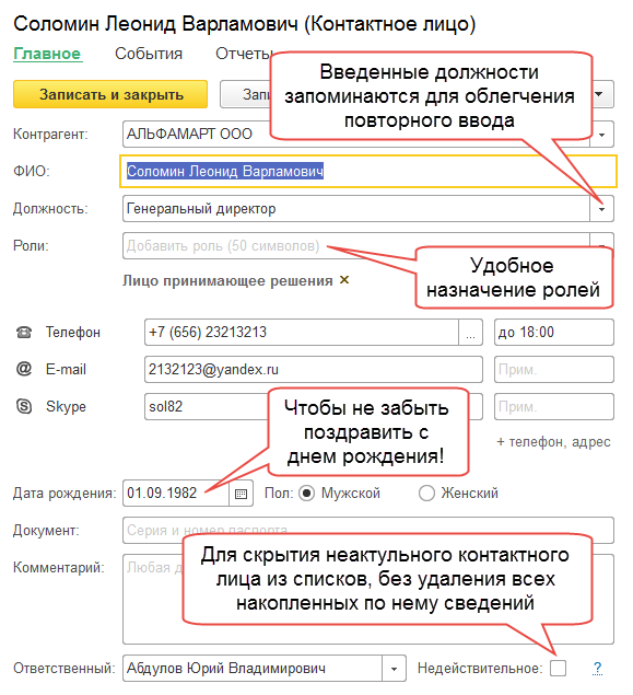Аналогичным образом, можно указать и недействительных контрагентов или их контактных лиц.