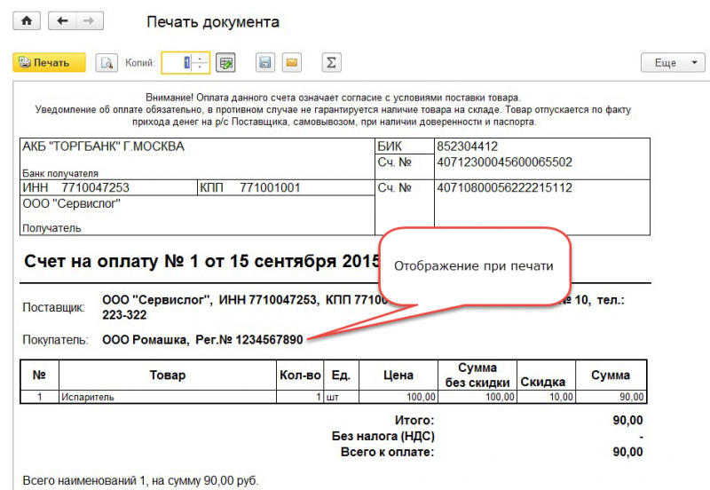 Если в карточке иностранной организации ИНН не указан, вместо него в печатных формах будет отображаться регистрационный номер рядом с наименованием контрагента.