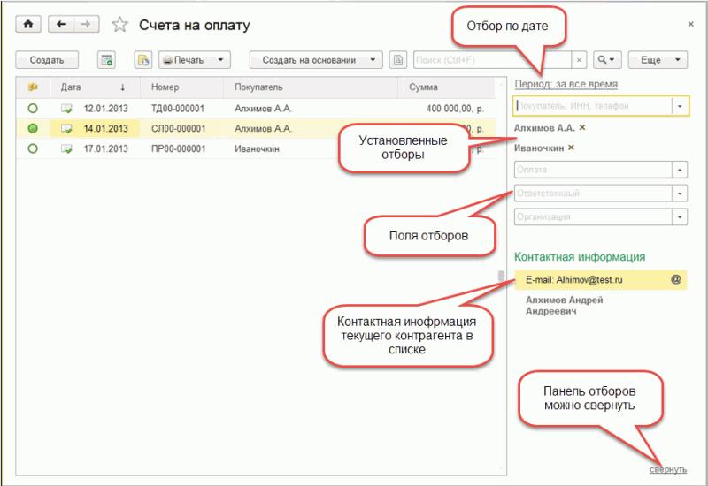 Ниже полей отборов размещается контактная информация контрагента из текущего документа в списке.