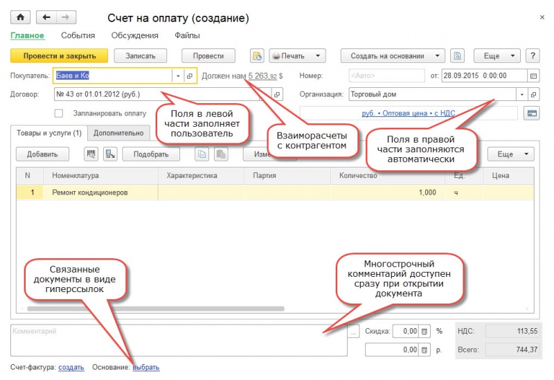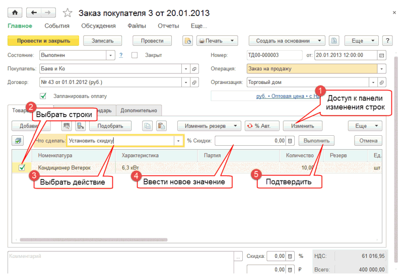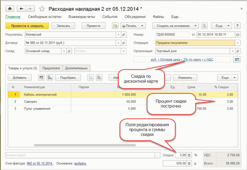 При изменении процента или суммы скидки, остальные поля и итоги документа пересчитываются. Если скидка указана суммой на документ, скидка распределяется по строкам пропорционально сумме строки.