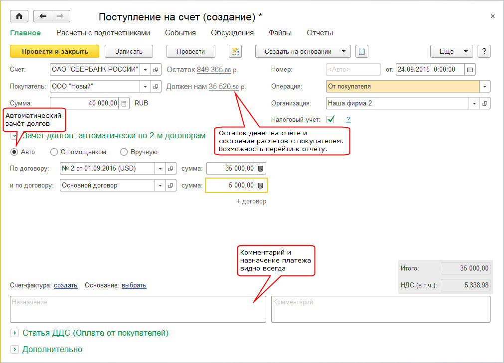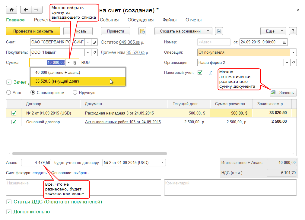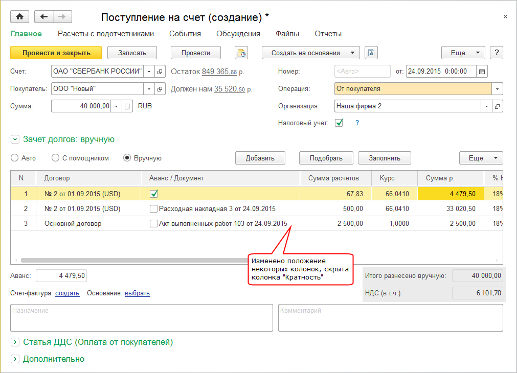 Добавлен помощник зачёта долгов, который позволяет быстро разнести сумму платежа по документам расчётов.