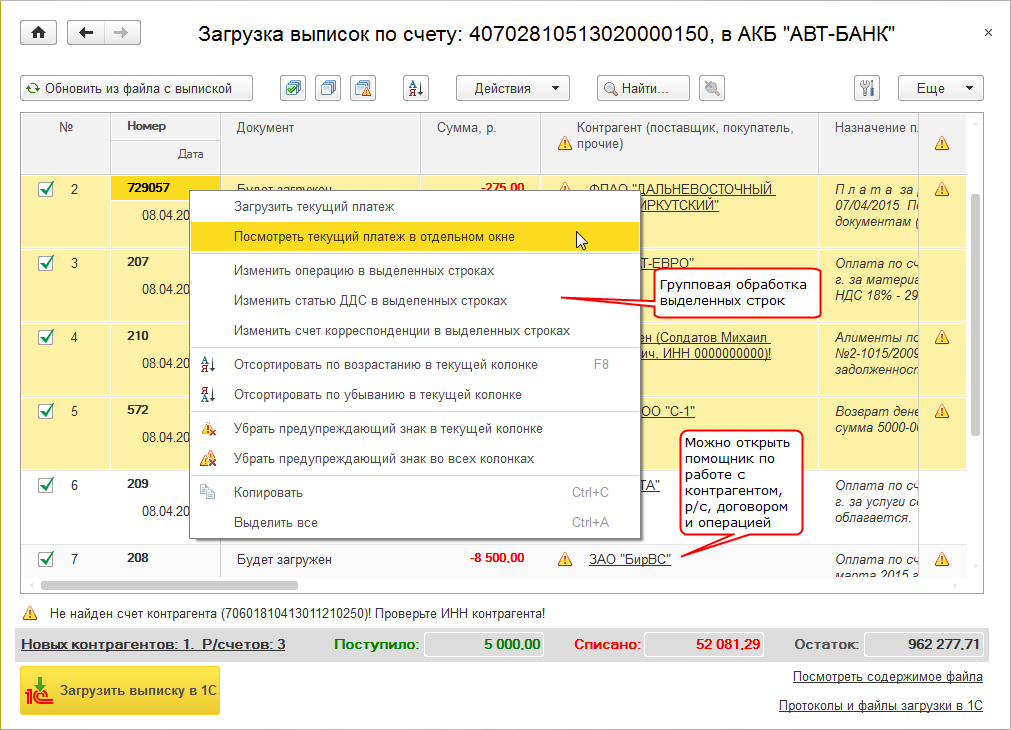 Для любого платежа можно открыть помощник по работе с контрагентом, расчётным счётом, договором и операцией.