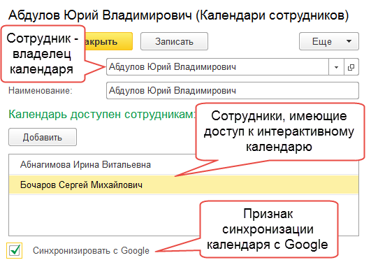 Для каждого сотрудника автоматически создается персональный календарь, а также возможно добавление произвольного календаря. Каждый пользователь может назначить предпочитаемый цвет записей для доступных ему календарей. Доступность календаря для сотрудников задается в карточке календаря.