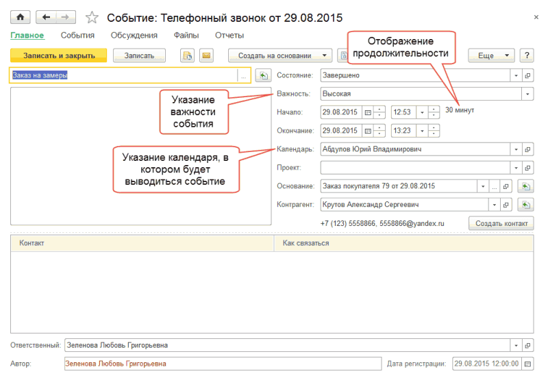 Из панели контактной информации можно быстро отправить e-mail или ввести новое событие.