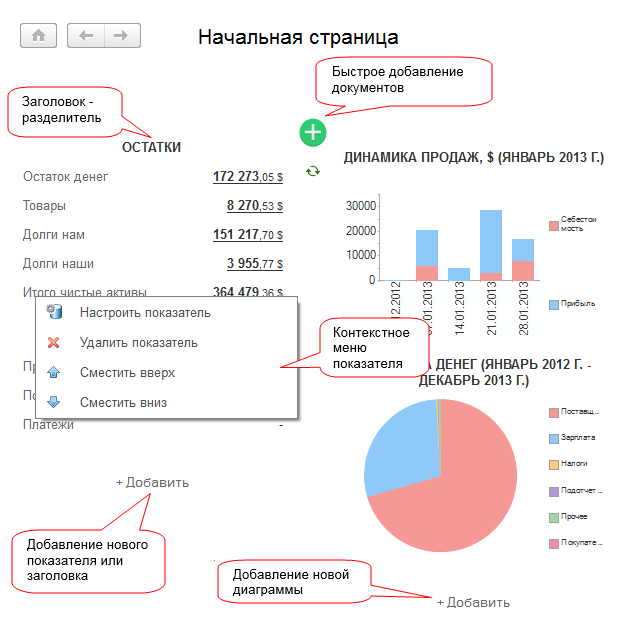 На нём можно разместить выбранные из широкого перечня настраиваемые показатели и диаграммы. Поддерживается вывод показателей денежного и товарного учета, взаиморасчетов, продаж и финансового анализа.