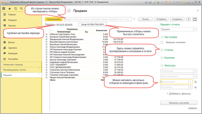 Список фильтров и положение правой панели запоминается и восстанавливается при повторном открытии формы списка.
