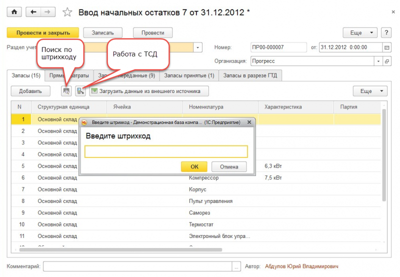 Теперь можно использования сканер штрихкодов и терминал сбора данных для заполнения документа «Ввод начальных остатков»