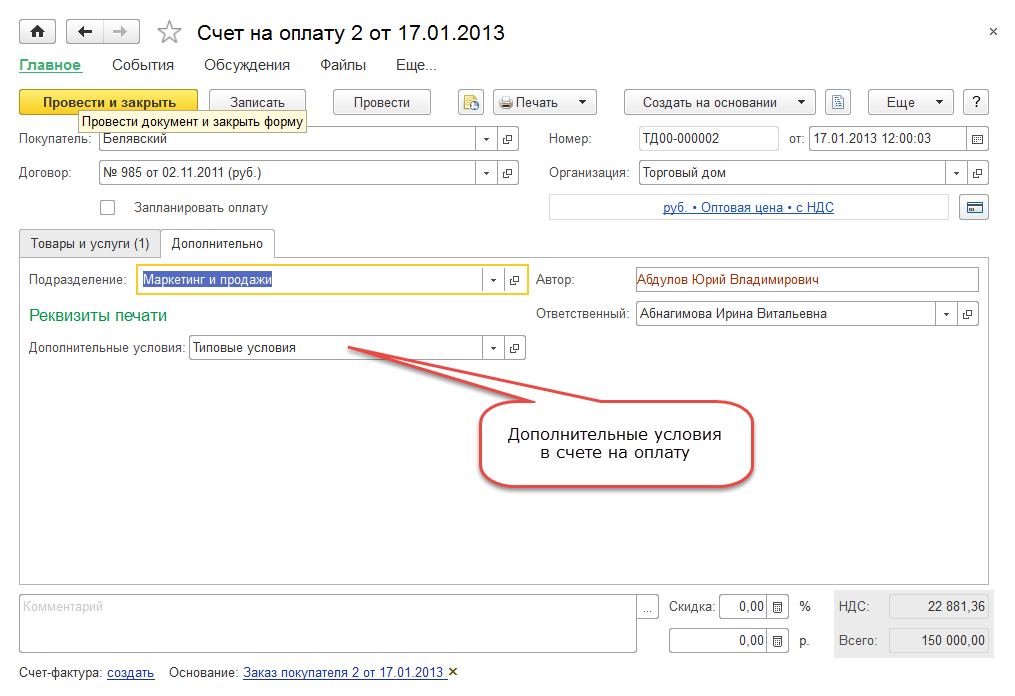 Добавлена возможность указать дополнительные условия в документе «Счет на оплату».