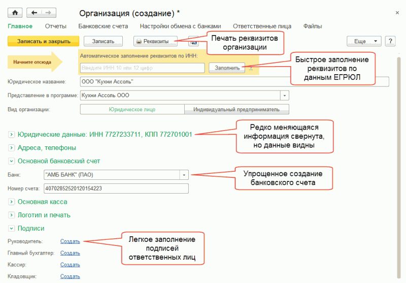 При добавлении новой организации, появилась возможность заполнить реквизиты по данным из ЕГРЮЛ / ЕГРИП.
