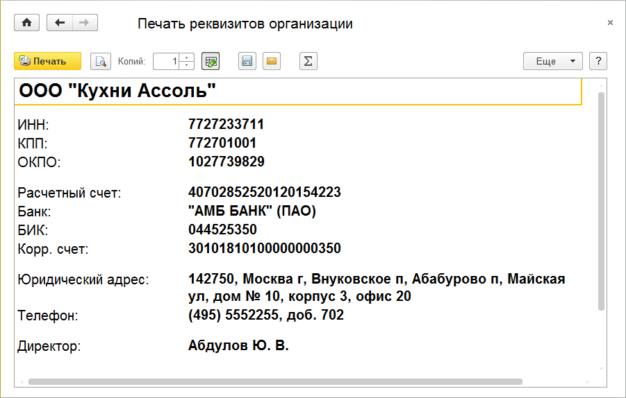 Перед выводом счета на печать программа сама предложит заполнить недостающие поля, такие как ИНН, КПП, банк, номер счета, логотип и факсимильная печать.