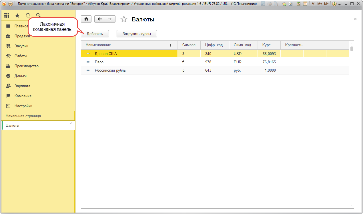 Теперь в форме списка валют всего две кнопки: «Добавить» и «Загрузить курсы».