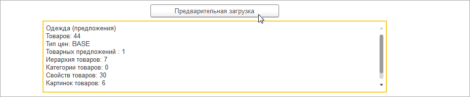 Перед итоговой загрузкой данных можно проверить состав данных, которые будут загружены в 1С (каталоги товаров и товарные предложения).