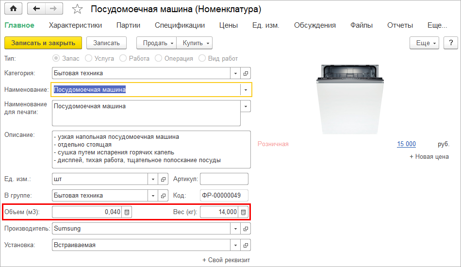 Если в карточке товара (справочник Номенклатура) внесена информация о габаритах, суммарный объем и вес заказа могут быть рассчитаны автоматически на основании данных справочника.