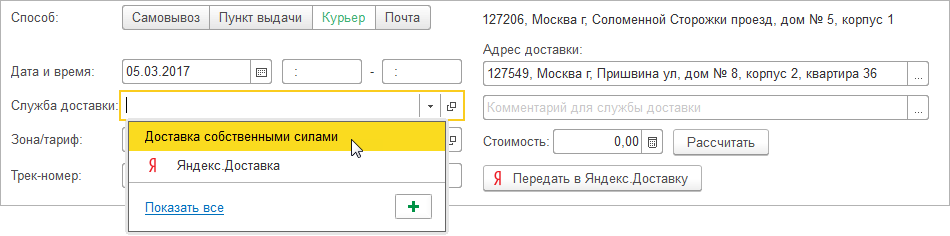 В рамках данного решения реализована работа с сервисом Яндекс.Доставка. Рассмотрим этот вариант подробнее.