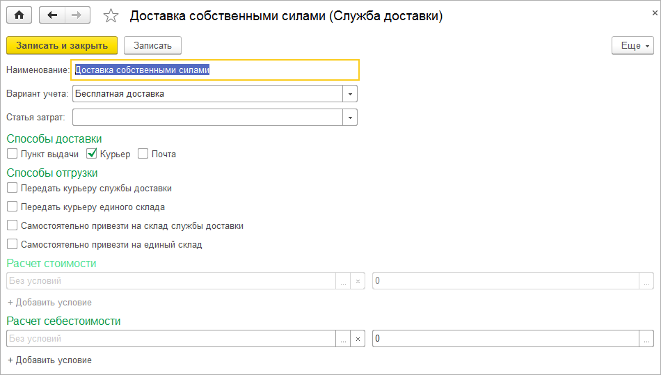 В элементе справочника мы храним информацию о способах доставки и отгрузки конкретной службой, расчете стоимости доставки и способе учета затрат на доставку (если таковые имеются).