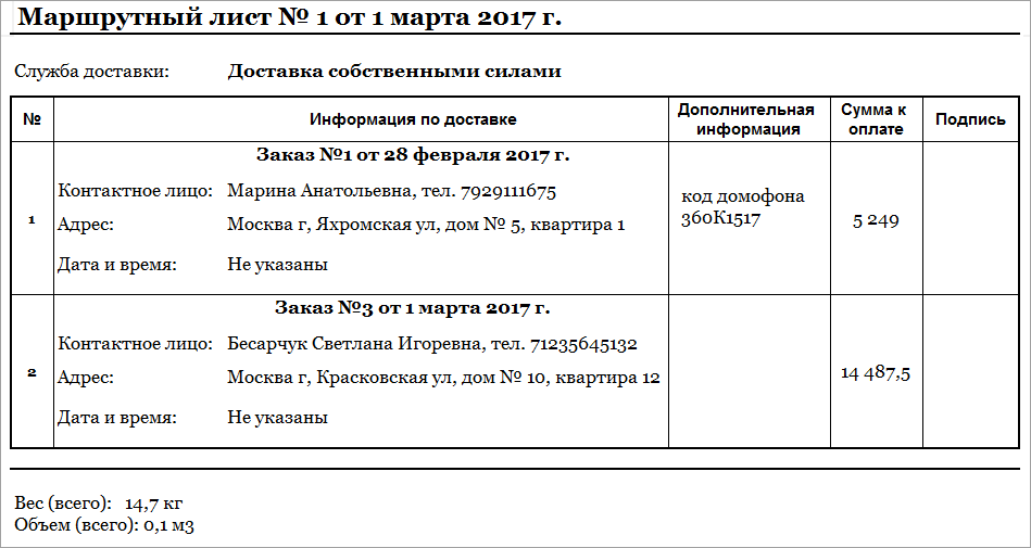 В печатной форме маршрутного листа содержится вся необходимая курьеру информация:
