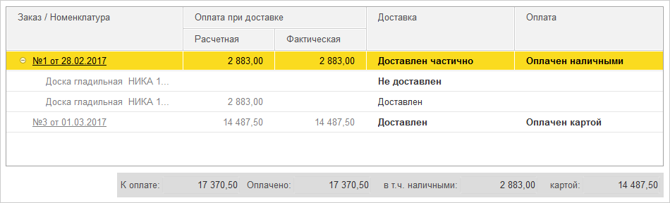 В программе предусмотрен сценарий частичной доставки, когда в заказе есть несколько товаров и при получении заказчик отказался от части, забрал и заплатил только за часть. При установке статуса заказа Доставлен частично, заказ будет расшифрован до товарного состава. Статус потребуется установить для каждой товарной позиции в заказе.