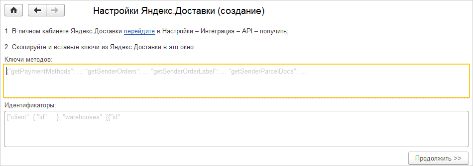 При первом выборе появится окно подключения к Яндекс.Доставке. В нем необходимо скопировать данные из