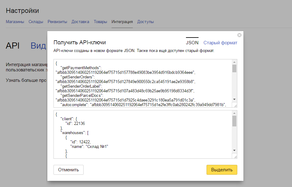 личного кабинета Яндекс.Доставки в соответствующие поля.