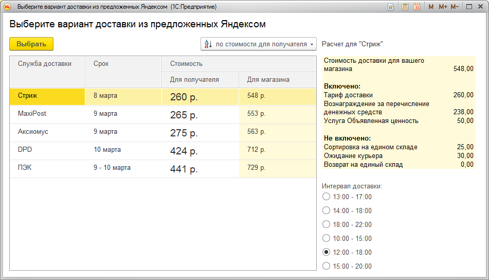 После того, как настройки выполены, в заказе при выборе Яндекс.Доставки будет появляться окно с выбором конкретной службы доставки. В окне выбора приведены все параметры, необходимые для принятия решения о том, через какую службу выгоднее всего отправить конкретный заказ.
