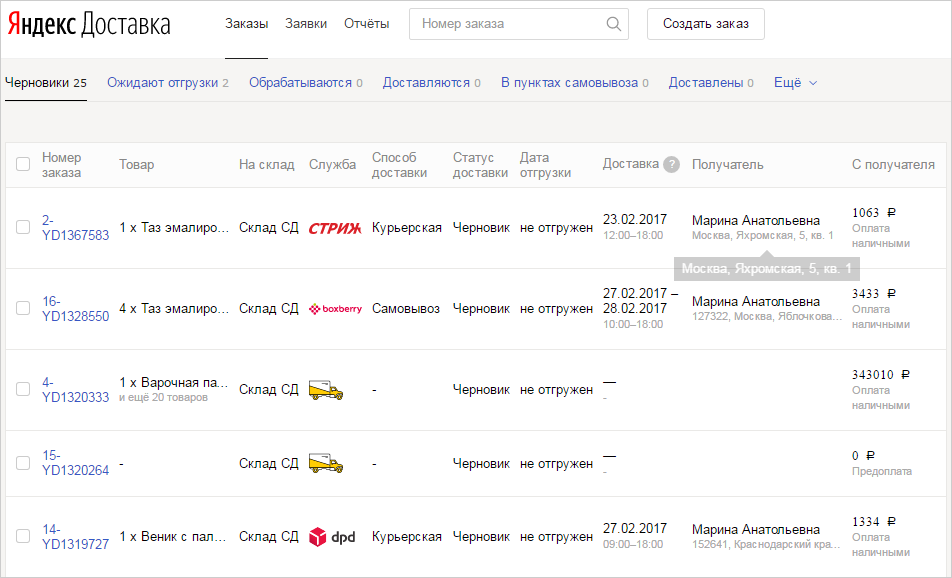 Дальнейшее управление доставкой происходит в личном кабинете Яндекс.Доставки.