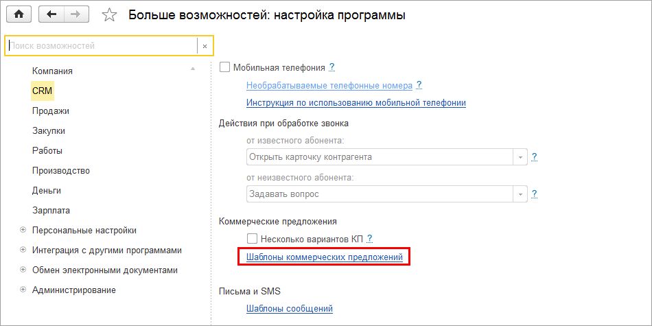 Пользователь может использовать шаблон КП, предложенный разработчиками, или создать свой шаблон. Создать или изменить шаблон коммерческого предложения можно в настройках раздела CRM (CRM - Еще больше возможностей - Шаблоны коммерческих предложений) или непосредственно из подменю Печать документа Заказ покупателя.