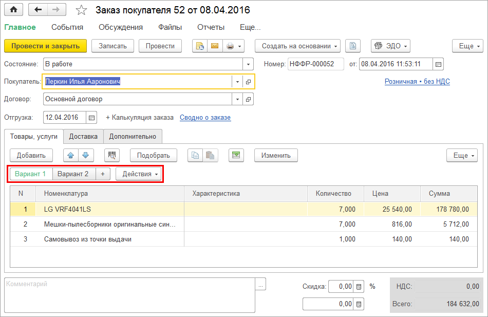 При включенной опции, в форме документа Заказ покупателя появится кнопка Вариант.