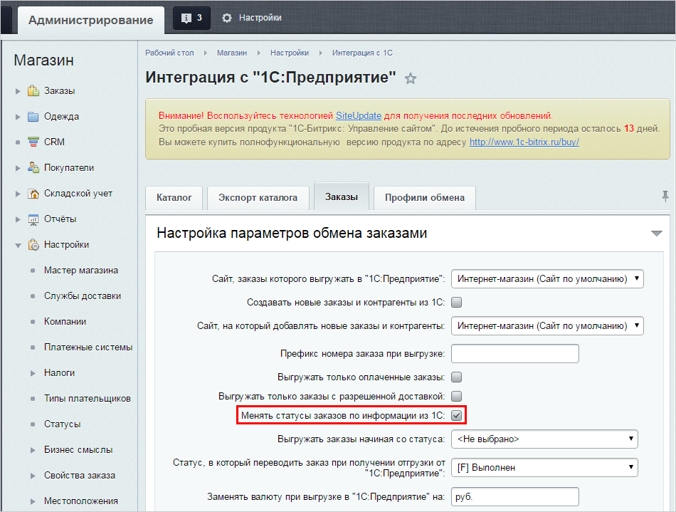 Теперь в настройку обмена с сайтом добавлена колонка Код статуса. Для корректного сопоставления в настройке обмена заказами (CRM-Настройки обмена) необходимо заполнить таблицу соответствия состояний. При этом если Код статуса не указан, поиск состояния заказа будет, как и раньше, происходить по названию статуса.